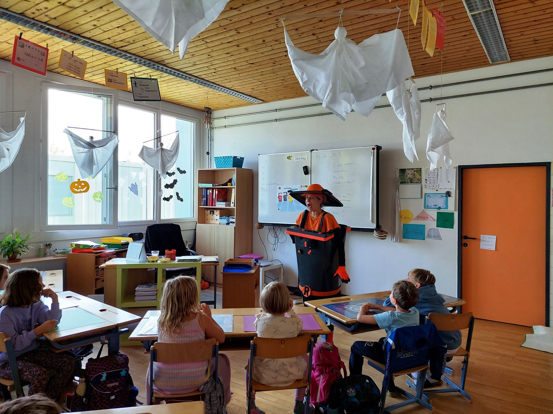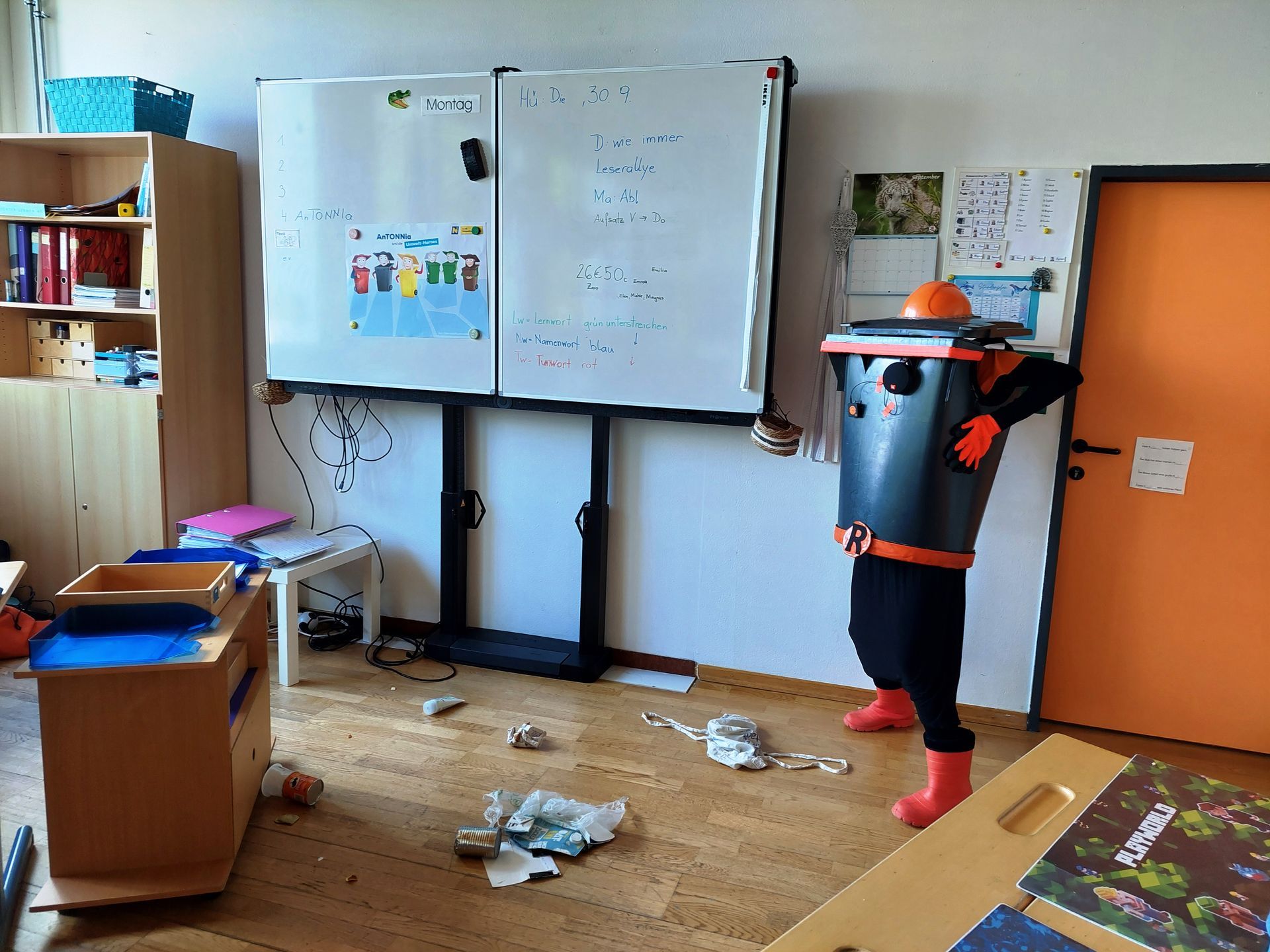 Eine volle Mülltonne besuchte die Kinder der 2a und 2b und beklagte sich darüber, dass viele Menschen den Müll nicht richtig entsorgen. Gemeinsam halfen wir ihr, den Müll in die richtige Dose zu werfen. Besonders lustig war das Müll-lied. Jetzt sind wir Müllprofis 😊