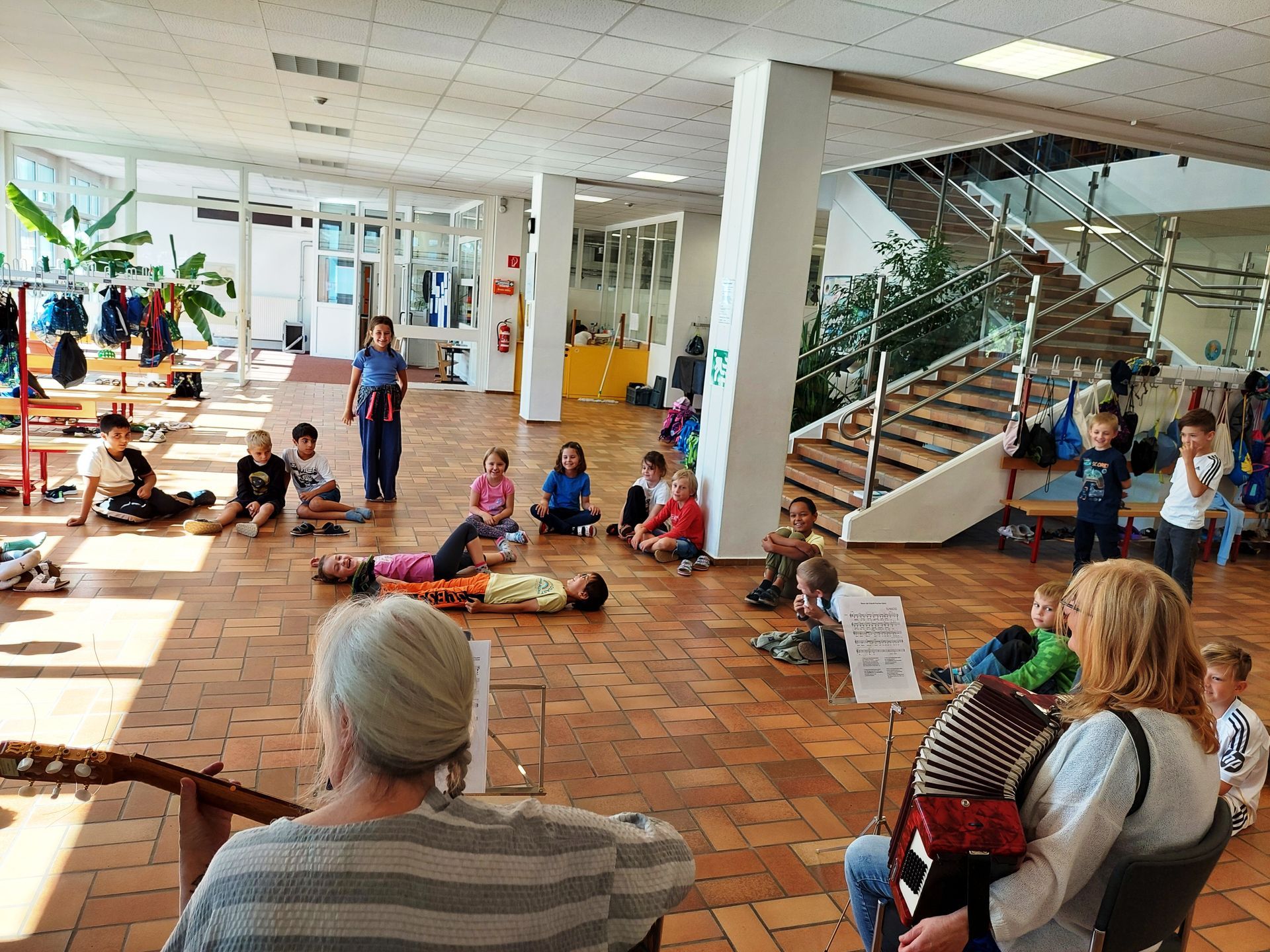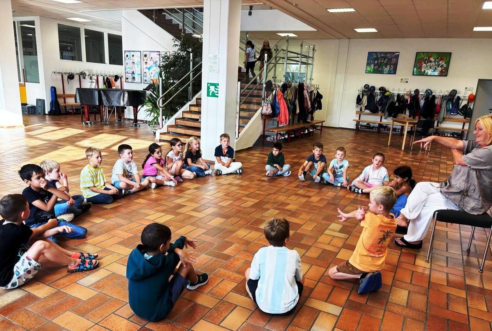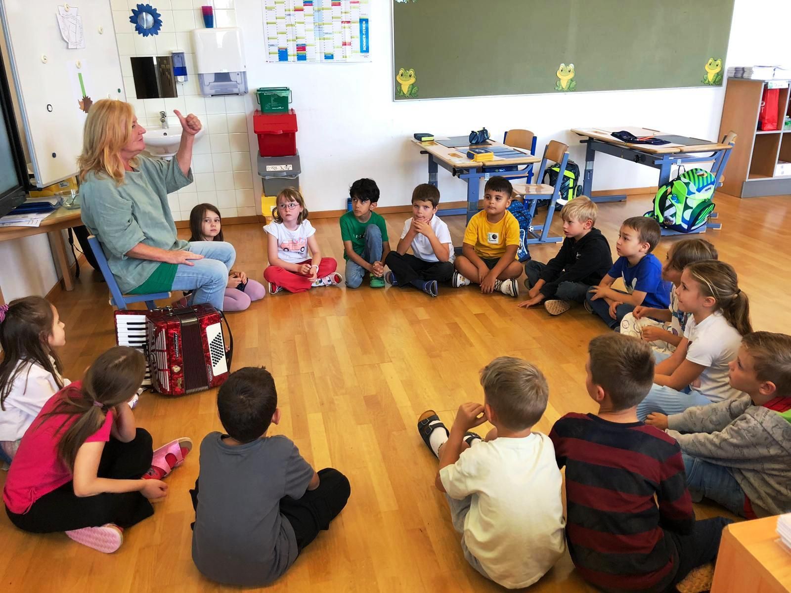 Jede Woche singen die ersten Klassen gemeinsam mit Frau Direktorin Rottensteiner lustige Lieder, die sie auch darstellen und spielen.