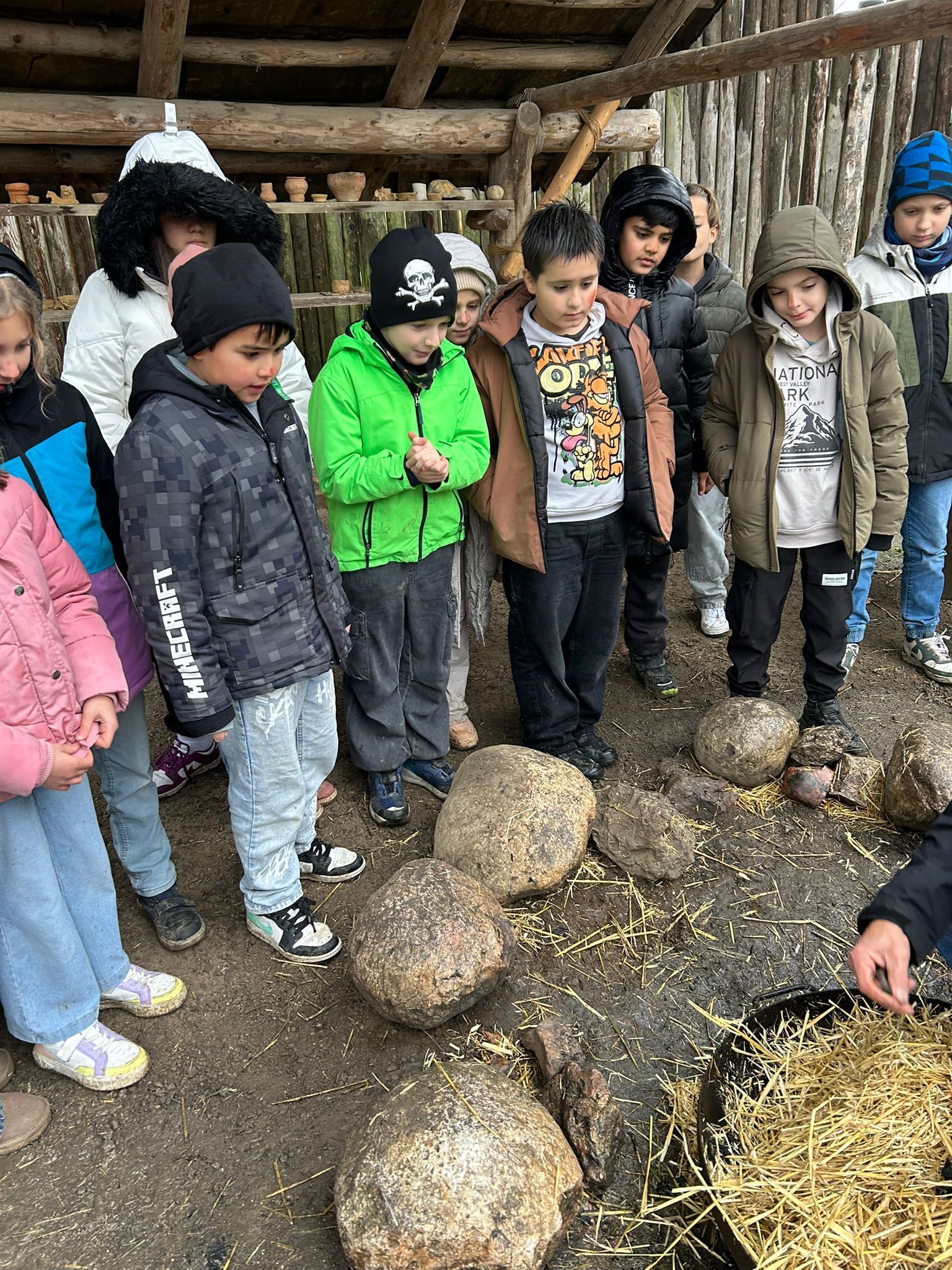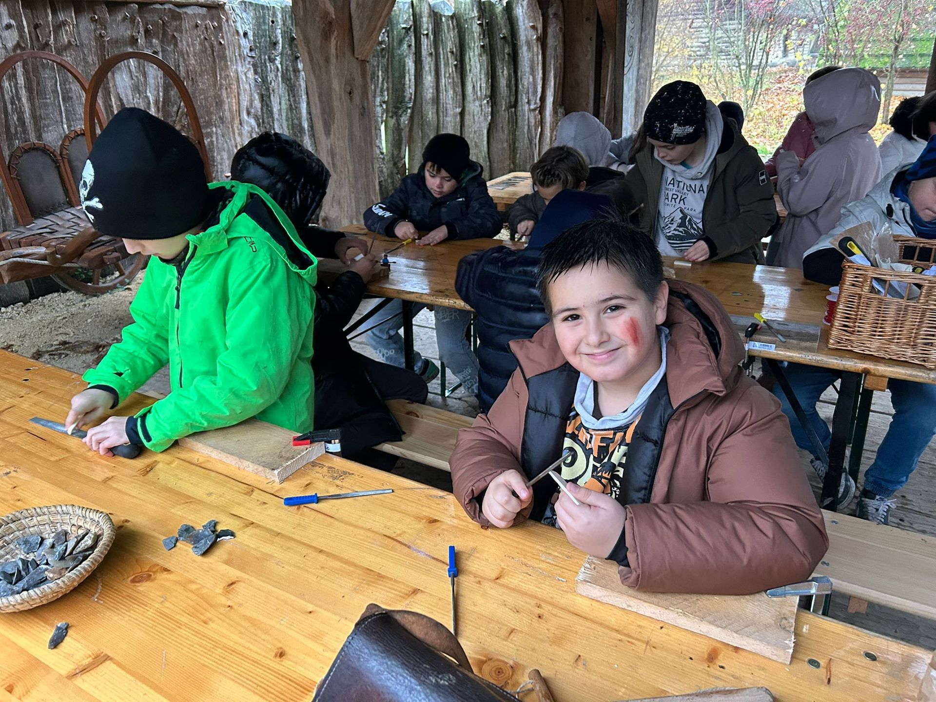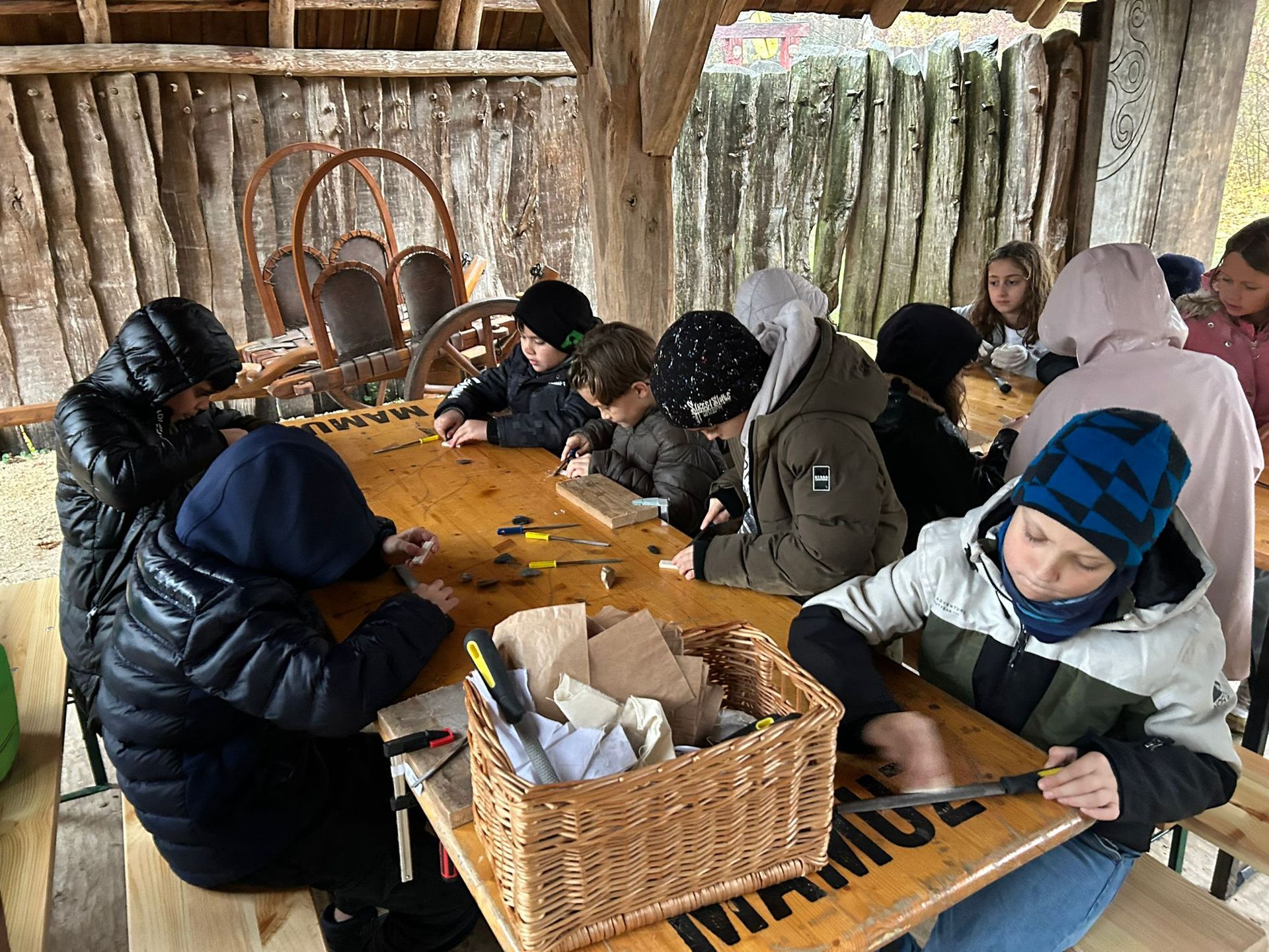 Die Kinder der Klassen 4abc erlebten einen ganz besonderen Tag im MAMUZ. Gemeinsam tauchten wir tief in das Leben der Steinzeit ein und lernten, wie Menschen damals ihren Alltag meisterten. Ein echtes Highlight war die Jagd auf ein Mammut mit einem Speer, das war ein spannender Einblick in die Überlebensstrategien vergangener Zeiten. Außerdem stellten wir aus Knochen unseren eigenen Schmuck her und merkten schnell, wie viel Geduld und Geschick dafür notwendig sind. Trotz Dauerregen gelang es uns, ein echtes Feuer zu entfachen, an dem wir uns zum wärmen konnten. Ein lehrreicher, abwechslungsreicher und unvergesslicher Tag für die Kinder der 4. Klassen.